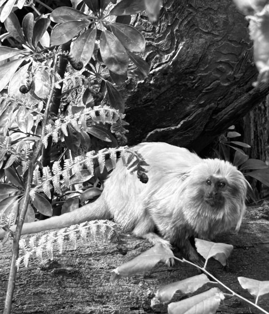 Golden lion Tamarin Monkey searching for something to eat. Stunning amongst foliage of the rainforest.