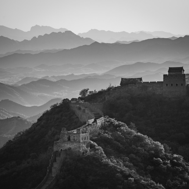 Dusk at the Great Wall of China and the layers of mountains beyond