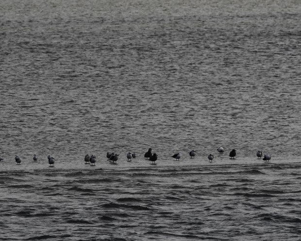 Macquarie Harbour at Strahan, Tasmania has some treacherously shallow depths. Gulls take advantage of the shallow water between the deep sections to rest.