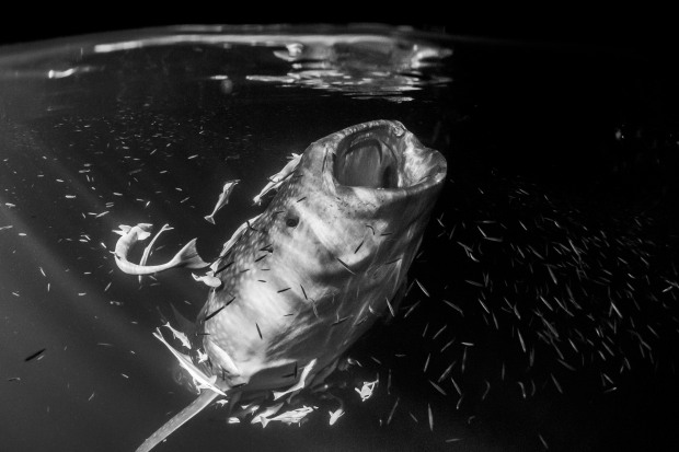 A majestic whale shark rises from the depths, its massive mouth agape as it feeds in the dark waters. A flurry of tiny fish scatters in its wake, while graceful remoras swirl around, drawn into the gentle giant’s orbit.