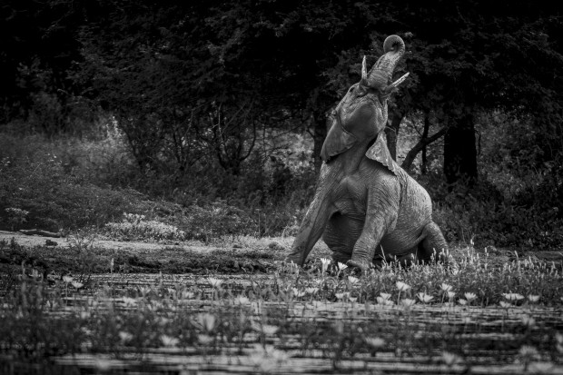 During the heat of the day, we were at a waterhole within the Greater Kruger National Park watching a herd of elephants coming down to drink. One playful elephant broke away from the family herd to splash in the mud and waterlilies, and formed the strangest pose I have ever seen an elephant do.