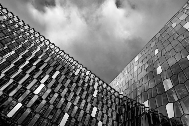 The geometric facade of the Harpa Concert Hall, Reykavik inspired by Iceland's many basalt rock formations.