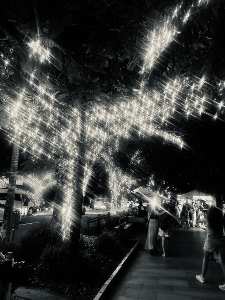 Night photo of street with fairy lights