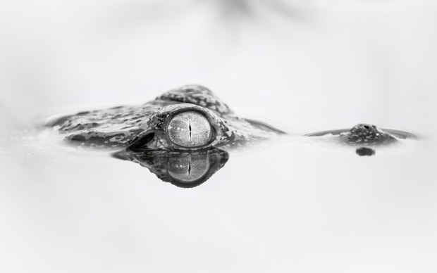 A baby crocodile stays perfectly still in the water with barely more than his eye showing, Chobe National Park in Botswana