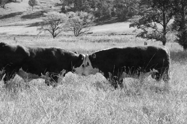 Two bulls in paddock 'play' fighting until it get serious.