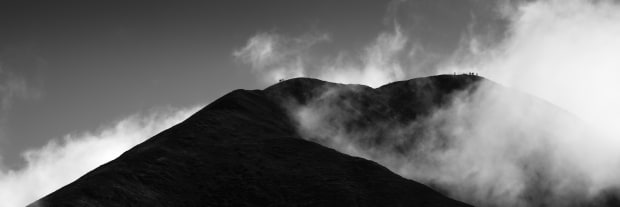 This was captured on a hiking trip using a telephoto lens, groups of hikers with their heads in the cloud, really help to show the scale of the mountain.