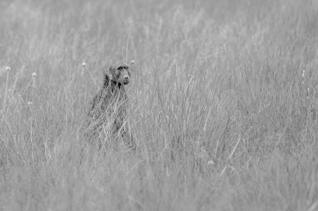 Through the savannah grasses a troop of baboons can be seen silently moving through. One of the baboons momentarily pauses to look about and this is when I capture this image.