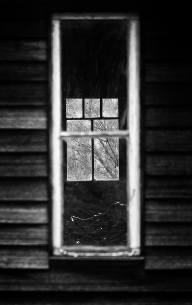 This is an old cabin on my property. When I took the photo I was aligning the windows and didn't notice the bicycle handles from the bicycle that is inside the cabin. It adds a subtle detail to a rustic Australian rural image.