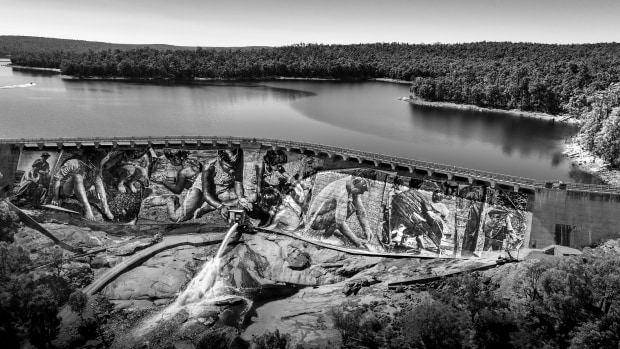 Wellington dam presents an incredible large ( or huge) scale history mural.