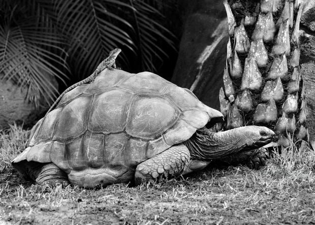 A Bearded Dragon hitching a ride on a Galapagos Giant Tortoise