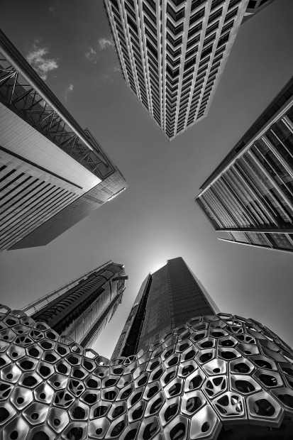 The metallic bee hive inspired wrapping around the bottom floors, is striking to the eye and a dream to photograph. The almost completed towers on 300 George Street, Brisbane, Queensland.
