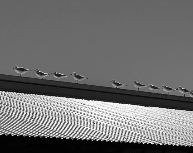 Seagulls in a row basking in the sun. I am looking at pattern and simplicity