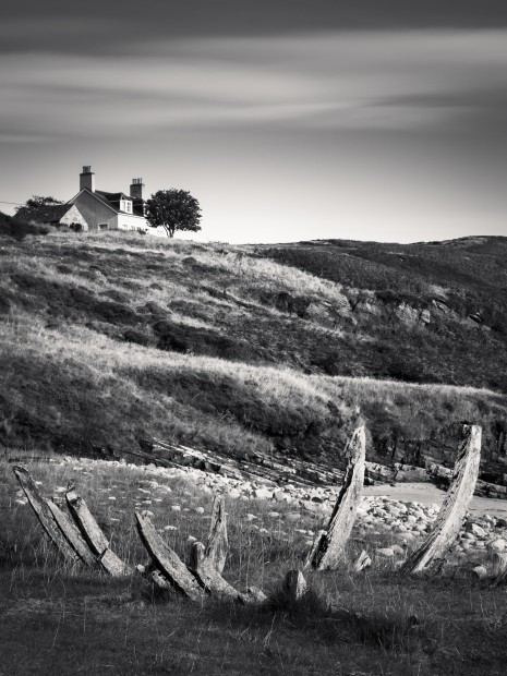 A bay on the north coast of Scotland, where a whitewashed cottage overlooks the bay. The remnants of a boat slowly decaying on the shore.