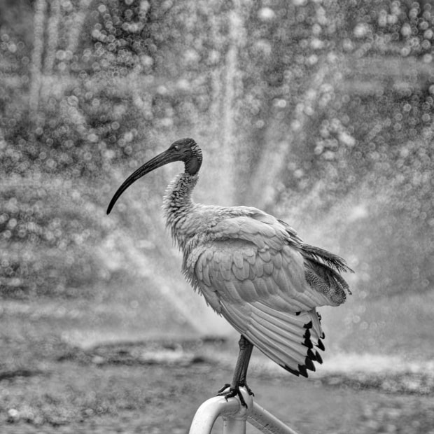 An Ibis (sometimes known as The Bin Chicken) enjoys the spray from a Fountain in Brisbane's City Botanic Gardens