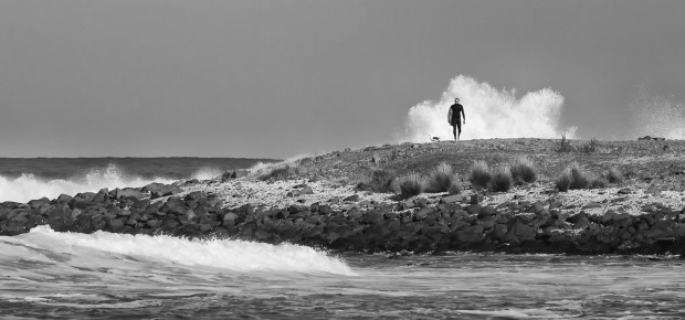 A lone surfer and a gull contemplating the ocean at Kelvedon Beach on Tasmania's east coast.