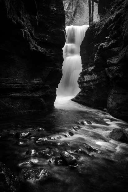 This Tasmanian mountain stream has inscribed it's flow through a cleft in the bedrock, through winter and spring this cascade plunges in to a hidden pool just out of the camera's view. Perched on slippery rocks, ringed by a deep pool the photographer left wondering just what it looks like beyond the cleft.