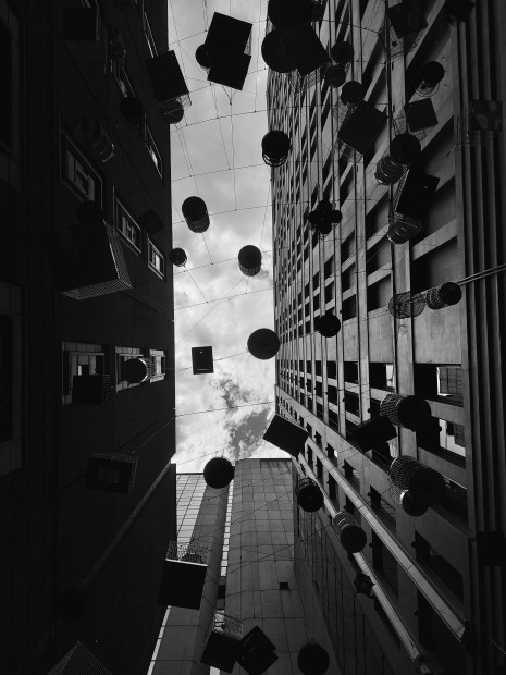 The world's people are all imprisoned in the grey routine of life itself, and if you look closely, you can see the web that ties all those cells together. Taken at Sydney, the bird cages.