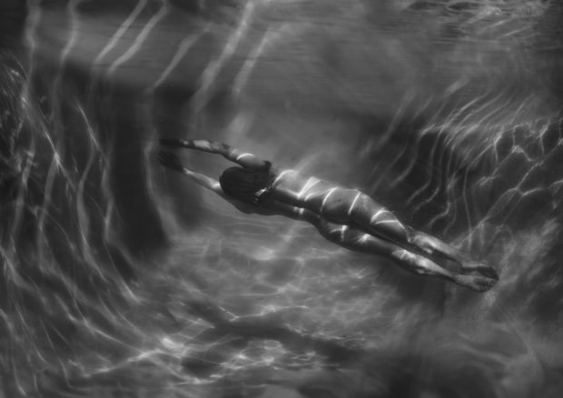 "Into the Light" is an experimental underwater series that merges digital photography, ink, lake water, and darkroom techniques to create a striking final image. At its heart is a model, suspended gracefully in water, bathed in ethereal light that accentuates both her form and surroundings. To enhance the digital image, the photographer employed an innovative layering photogram technique. Ilford photosensitive paper was submerged in the same lake water where the model had posed. Using two paintbrushes—one dipped in detergent, the other in carbon ink—the photographer created concentric marbled rings on the water’s surface, visually echoing the fluid environment. An enlarger then projected light onto the photo paper, capturing these delicate, shifting patterns as they floated and dispersed. Once scanned and layered over the original digital photograph, these organic formations—resembling radiant beams of light—introduced a captivating interplay of texture and form. The result is an image that feels both mysterious and otherworldly, reflecting the dreamlike, introspective state of the model beneath the water.
