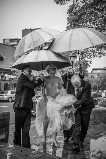 Bride arriving to church on her wedding day in the rain as she is sheltered with several umbrellas by the drivers and her father.