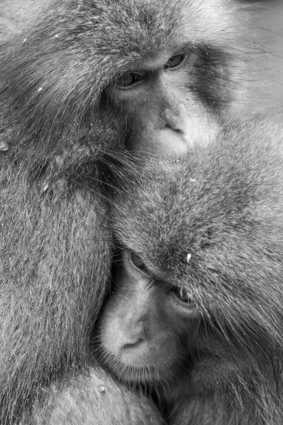 Two Macaques keeping warm by huddling together.