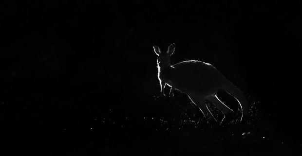 A western grey kangaroo leaps into the frame in backlight at Cheynes beach, with the light hitting the wild flowers creating a look like snow around the Kangaroo.