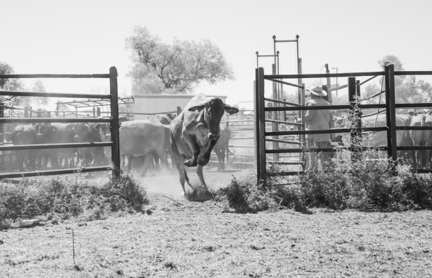 a cow jumping on her way out of the yards