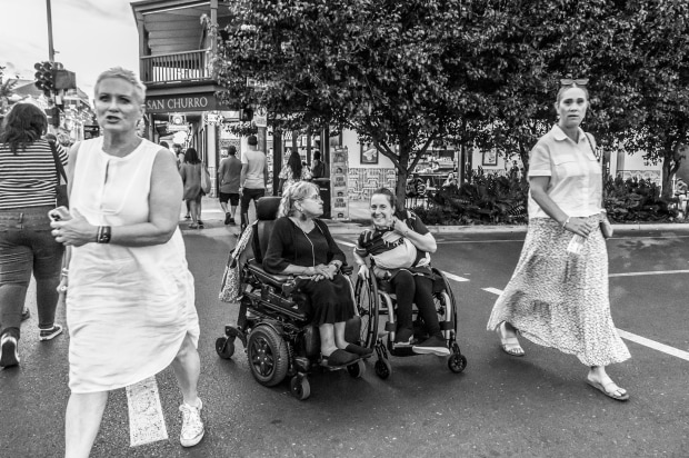 Street Photography of two ladies in Wheelchairs having a chat while others had to try and negotiate around them.