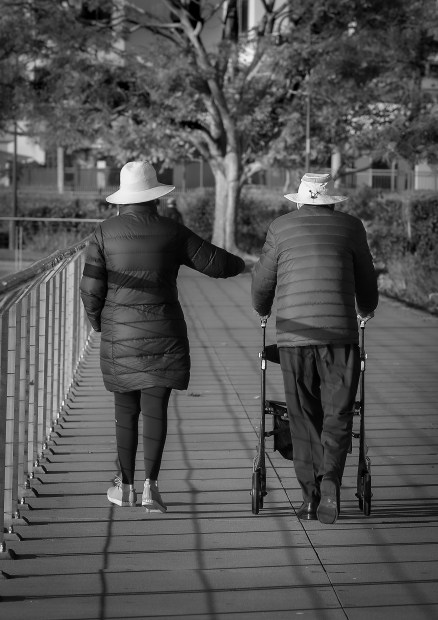 A lovely moment captured between a daughter and her elderly father just out for a walk in the winter sun.