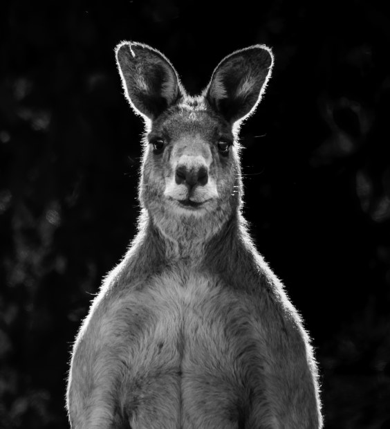While driving through Winton Wetlands towards sunset, I slowly approached a mob of kangaroos grazing along the side of the track. This 'back lit' male, stood out from the others. We looked at each other; I slowly lifted my camera and he allowed me to photograph his massive body, unperturbed. And as he continued to chew on the grass already in his mouth, I was able to capture the crinkle in his lips !