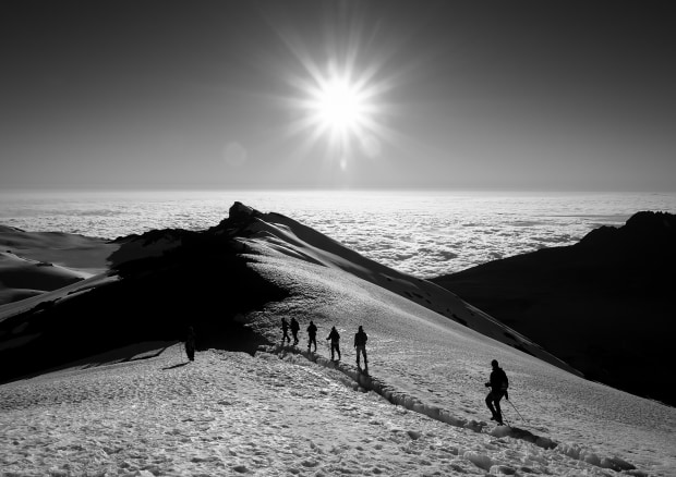 As the sun rises and the ice thaws, weary climbers make their way down from the Kilimanjaro summit.