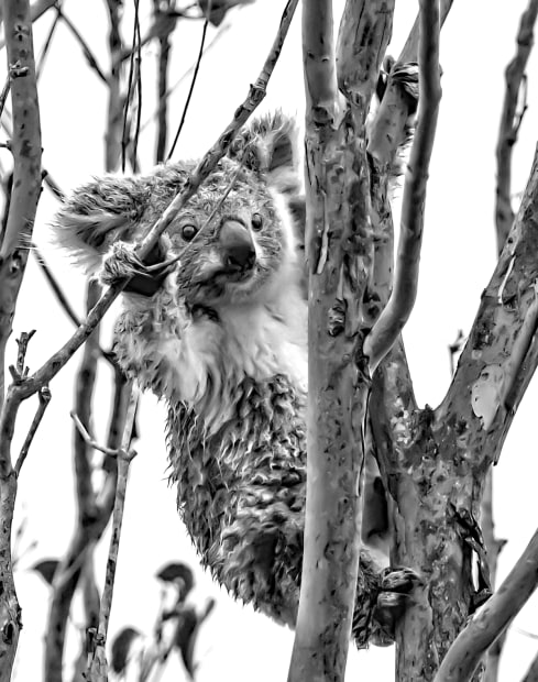 A very young koala baby maneuvering through the eucalyptus trees on a dull, rainy morning in SEQ.