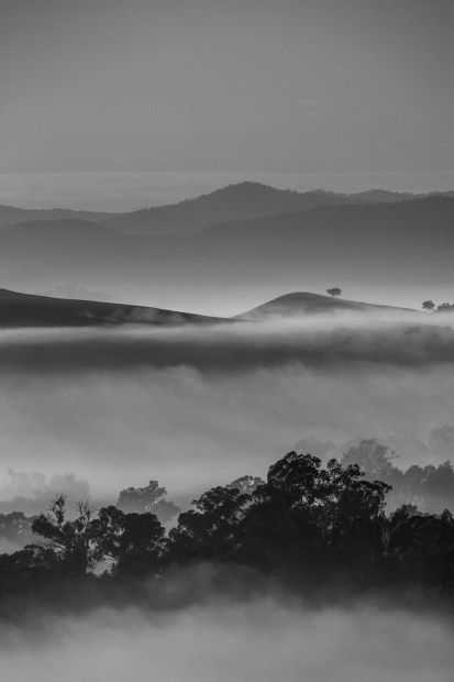 A contrast of inky trees in the foreground, mountains in the distance, and gentle rolling hills dotted with trees in between, creates landscapes within landscapes and celebrates the beauty of form, topography and texture in Nature.