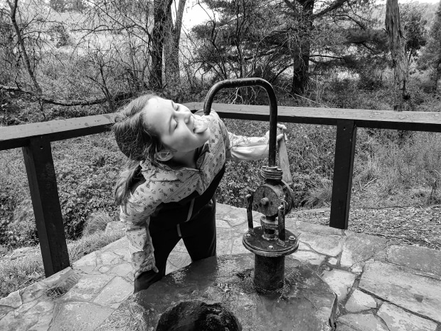 Young girl is pictured in a bush setting at a water pump, her mouth is open under the tap to catch the water drops