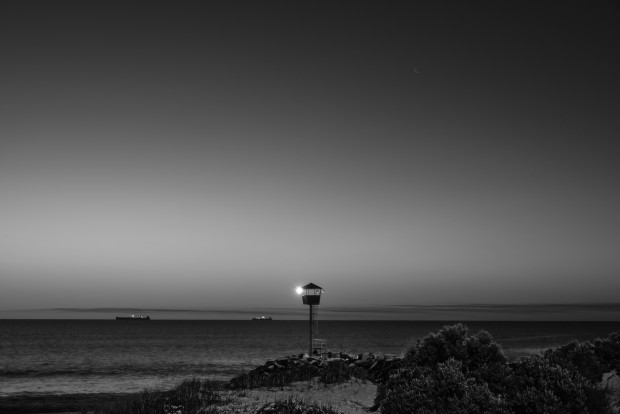 A tiny sliver of moon appears at dusk over the City beach lifesaving tower, Perth, Western Australia.