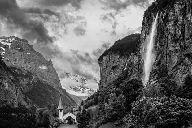 The charming chapel nestled in the valley offers a serene escape amidst the breathtaking scenery. A majestic waterfall cascades down towering cliffs, creating a mesmerizing spectacle of nature's power. This picturesque village in Swtizerland offers a unique blend of cultural and natural wonders, promising an unforgettable experience.