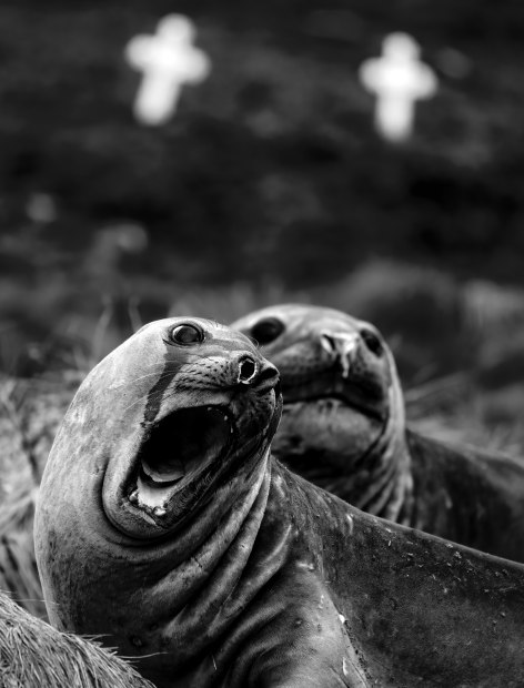 Around subantarctic South Georgia island, wildlife is reclaiming the old whaling and sealing stations - industrial-era sites that harvested elephant and fur seals, whales and even penguins to render their bodies into oil. At Ocean Harbour, these female elephant seals were living their best lives right next to a modest cemetery where men who once hunted their kind are now at rest. (side note, elephant seals are very much in touch with their feelings, but it's worth noting that their lacrimal gland produces tears to lubricate and protect their eyes, giving them the appearance of crying.). I know it's always more pleasing for images to include things in threes, but for this piece I thought doing pairs created more tension.