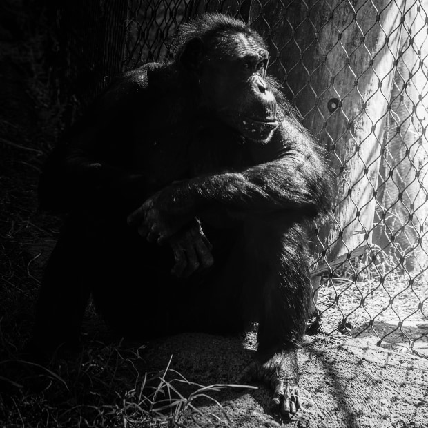 A chimpanzee peers through the mesh fence of his enclosure and appears to be pondering his life.