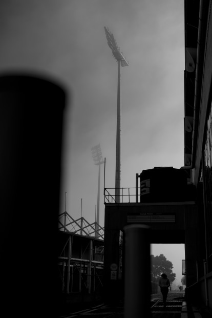 The massive towering structures of a stadium light towers in the fog showing how small us humans on the ground are as we walking past.