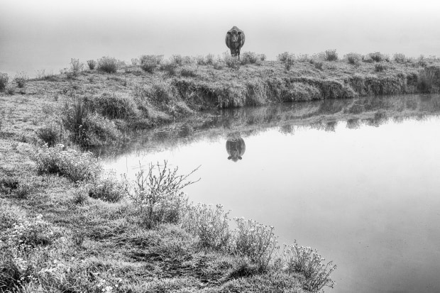 A foggy morning , a farm dam and a bull. What more could you ask for ?