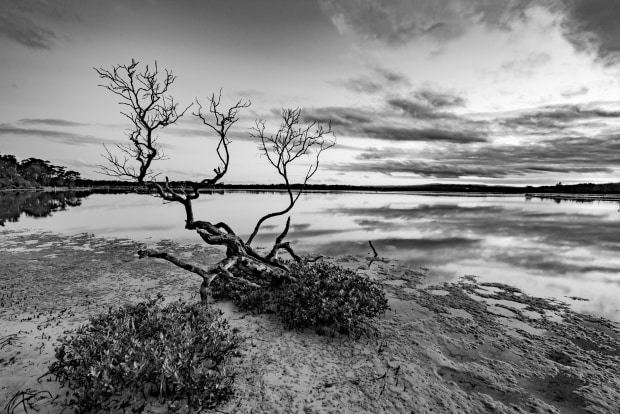This tree somehow hangs on to life on the tidal flats in Merimbula