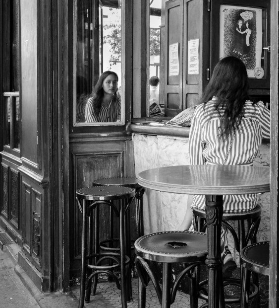 I found this scene while on a Street Photography course with Valérie Jardin in Paris last year. I was drawn to her framed portrait in the café mirror - juxtaposed with the backshot. A decisive moment with just one click as I kept moving so as not to disturb her moment or the scene. On looking at this the viewer may question - is she looking at or through and by me the photographer..
