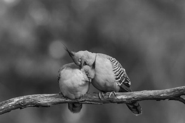 A Crested Pigeon pair tenderly preen each other. I love that I've caught this sweet moment of affection and they seem oblivious to my presence. Such beautiful coloured plumage on these birds but I find the black and white actually works and added to the intimate feel and mood of the image.