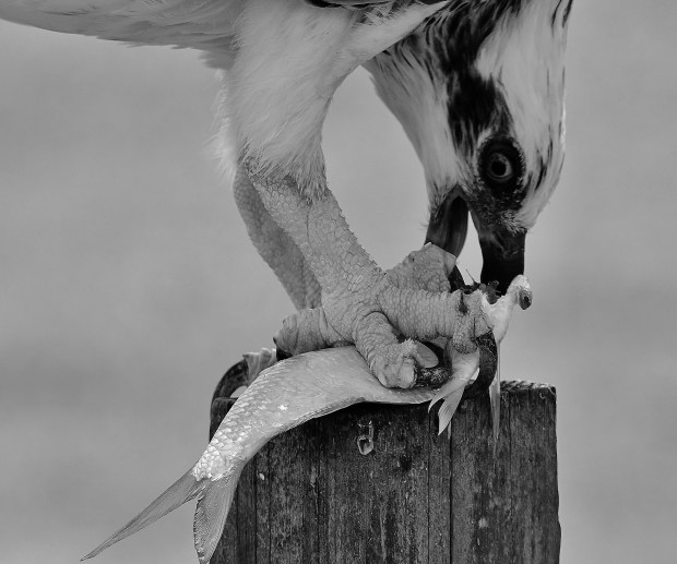 Found where this female Osprey lives and captured series of photos of her eating a fish for lunch