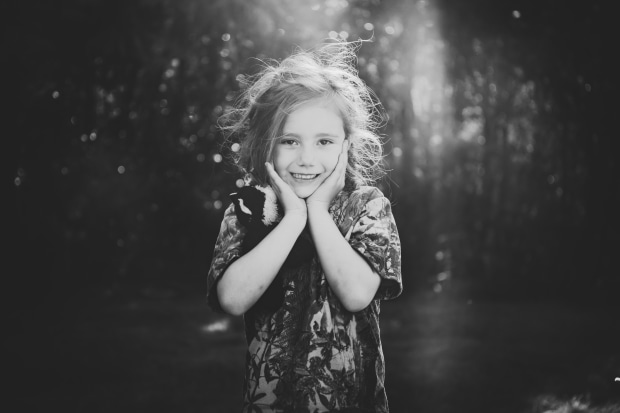 Girl in the forest with her beloved cat toy wearing a hunting top while the light shines through the trees in the background