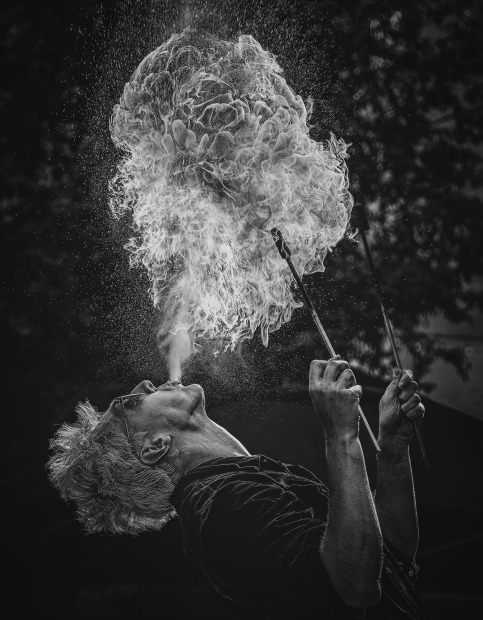 A street performer with blackened hands, a mouth full of flammable liquid, overalls, and safety glasses. Pursed lips spray the liquid skyward which then ignites in a plume that expands to resembles the unfolding petals of a flower.