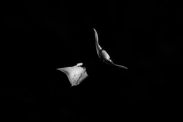 Two Reef Manta Rays dancing in a mating chain on the Ningaloo Reef, Western Australia