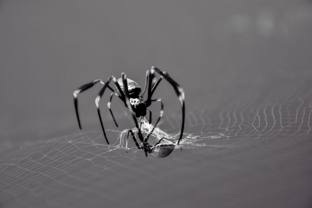 A young Golden Orb Weaver prepares to wrap a hapless bug caught in her Web.
