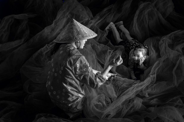 Mother is mending the fishing nets as her daughter watches on in Xiapu China