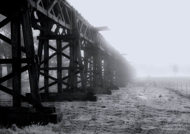 The old railway bridge at Gundagai NSW on a cold , frosty morning looms out of the mist defying the elements, standing proud as it once did but slowly losing the battle against time.