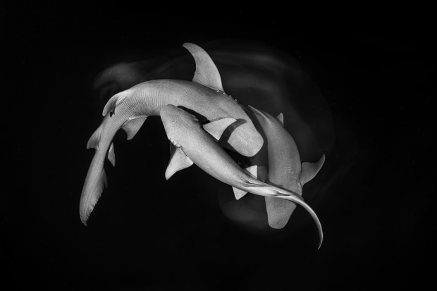 Three tawny nurse sharks dance together in courtship at night. Both males compete for the attraction of the female.